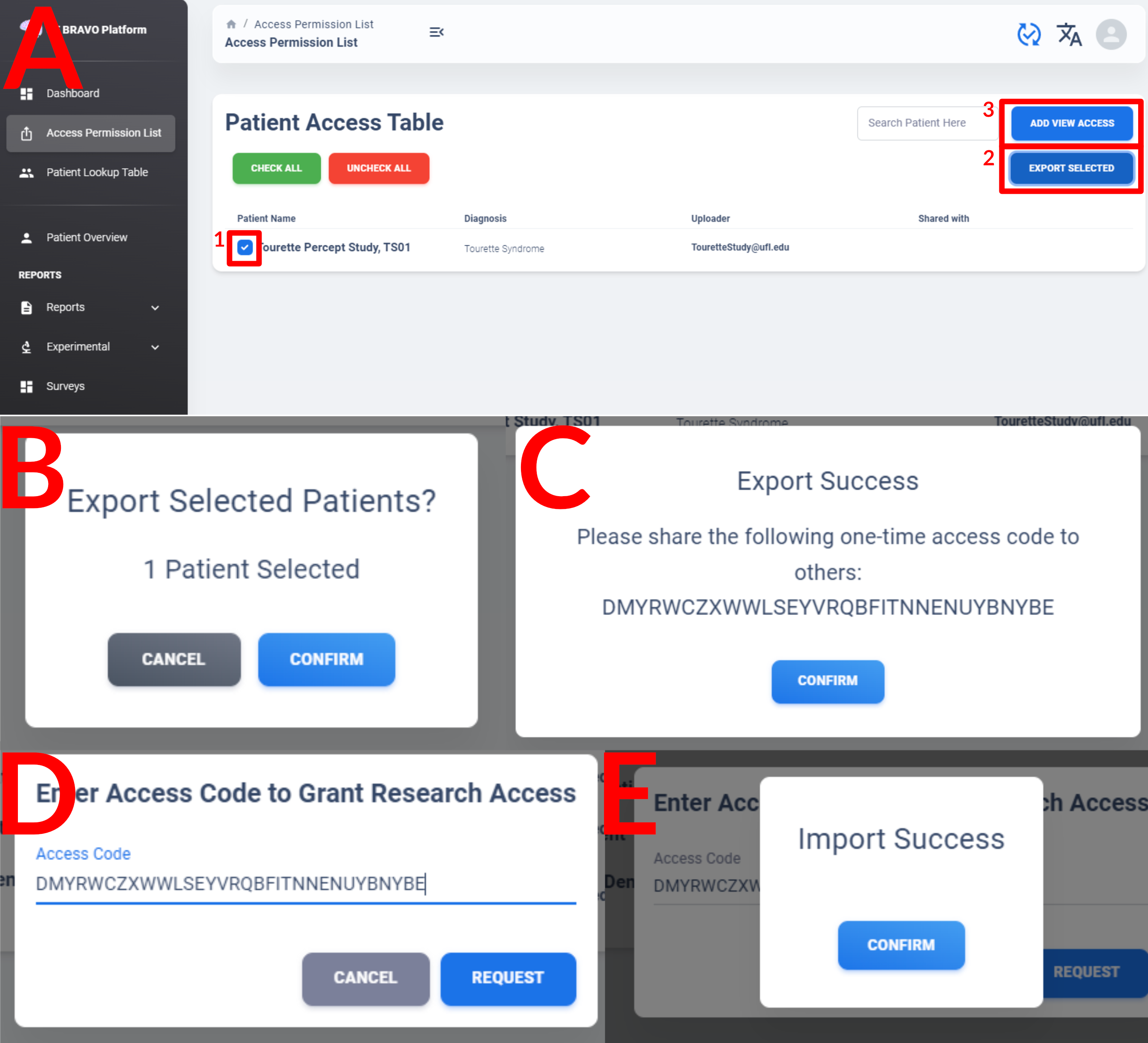 Check the patient ID corresponding to the patient you want to share with others (Figure A.1) and then click Export Selected to bring up the confirmation window (Figure B). Once confirmed, a one-time access code is generated by the server with 1-hour expiration time. Share the random string with others. The receiving user should log into their account on BRAVO Platform connecting to the same server endpoint as the one who created share-link, then click on Add View Access (Figure A.3) to paste the access code. If access code is added successfully, the user can navigate back to Dashboard and observe a new patient added to their “Accessible Patients” list as “Deidentified XXXXX-XXXX-XXXX”, where the blanked out string is the deidentified ID of the patient they have access to.