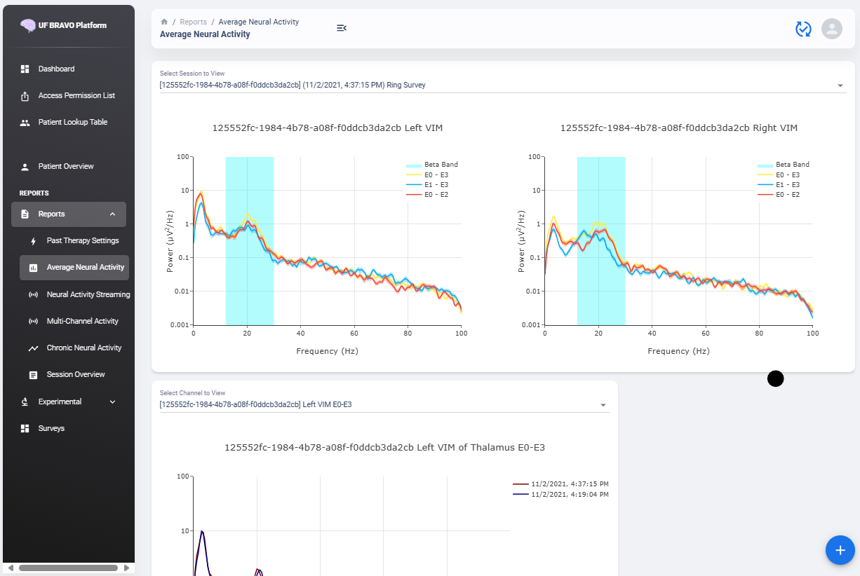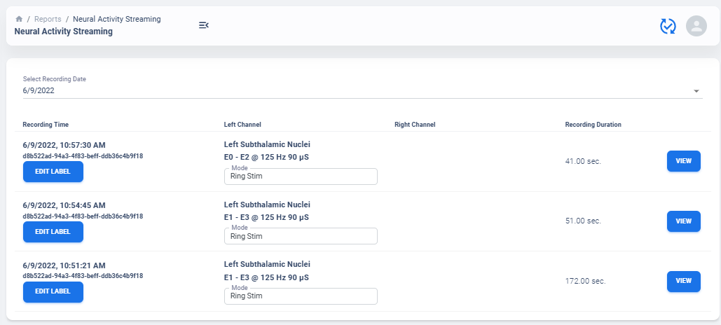 Similar to average neural activity page, Neural Activity Streaming data are aggregated for all patients. Recordings are organized by date of collection. The platform will also attempt to merge simultaneous Left/Right hemisphere recordings into one recording if detected. An example of the selection table is shown in above figures.
