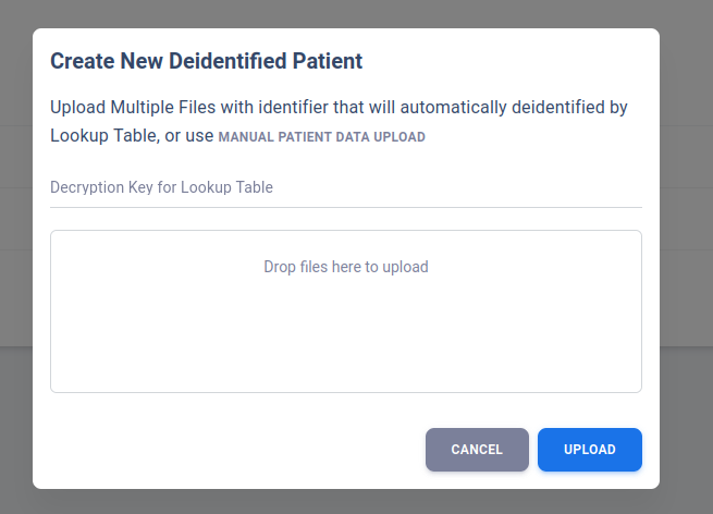 User may also opt to use the Batch Upload option with identified JSON file. The server will deidentify all identified file based on a simple encrypted lookup table upload by the user.