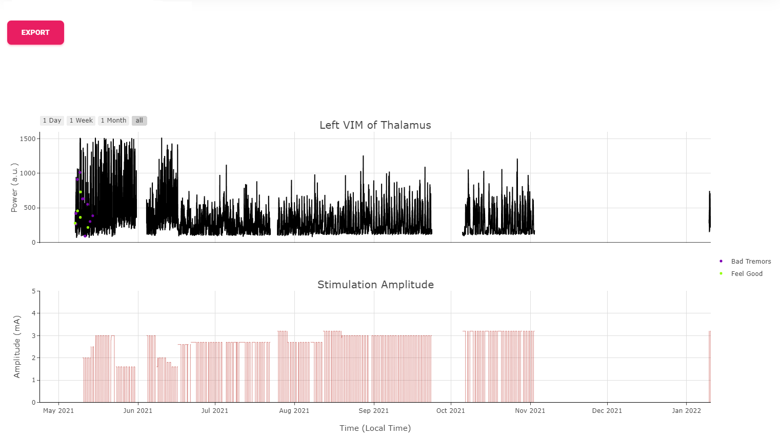 Average Neural Activity are snapshots of neural activity at the time of recording. We aggregated the Surveys collected over the span of patient’s visit at the institute to inform changes of brain signal at the target brain region as desease progress (or as therapy delivered).