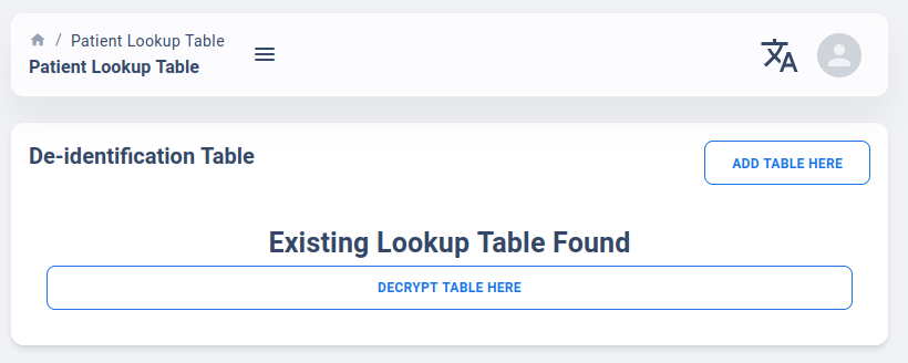 The Patient Lookup Table tab is a route only available on “Researcher Account”. By the default, the page will only tell user if there is an existing Lookup Table on the server for your account or not.