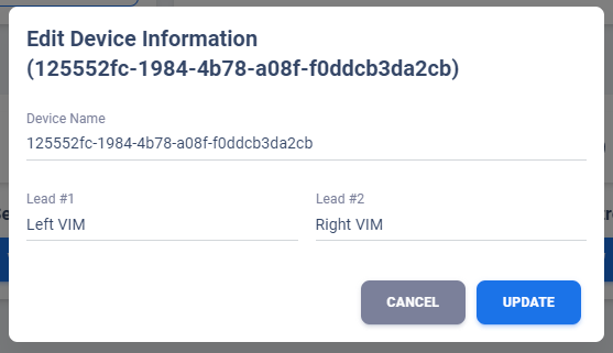 User can edit the device information through pen icon corresponding to each device in Device Table of Patient Overview Page. A pop-up dialog will be shown to user with existing patient information. Edit the desire fields then click UPDATE will prompt a database update.