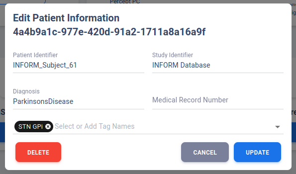 The Patient Table also contains tagging system, where user may assign tags to each study participants in Edit Patient Information page. The tags will also be used for filtering.