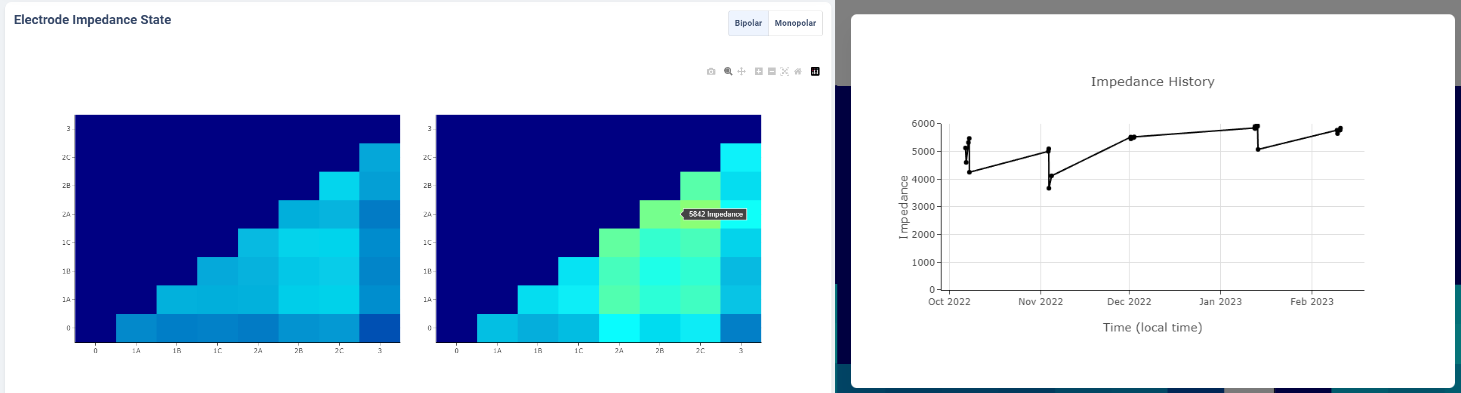 Below the therapy configuration table is the most recent Impedance recorded in the Session file. User may toggle between Bipolar Impedance and Monopolar Impedance. Hovering over the heatmap will show the exact impedance value.