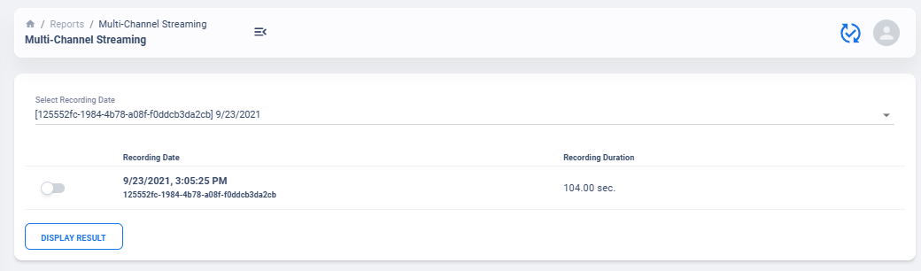 The recording selection is performed through toggle buttons. Each button indicate the time and duration of the recording. After recordings are selected, user can retrieve the data from server, and simple display will be used to allow interactive visualization of Indefinite Streaming data.