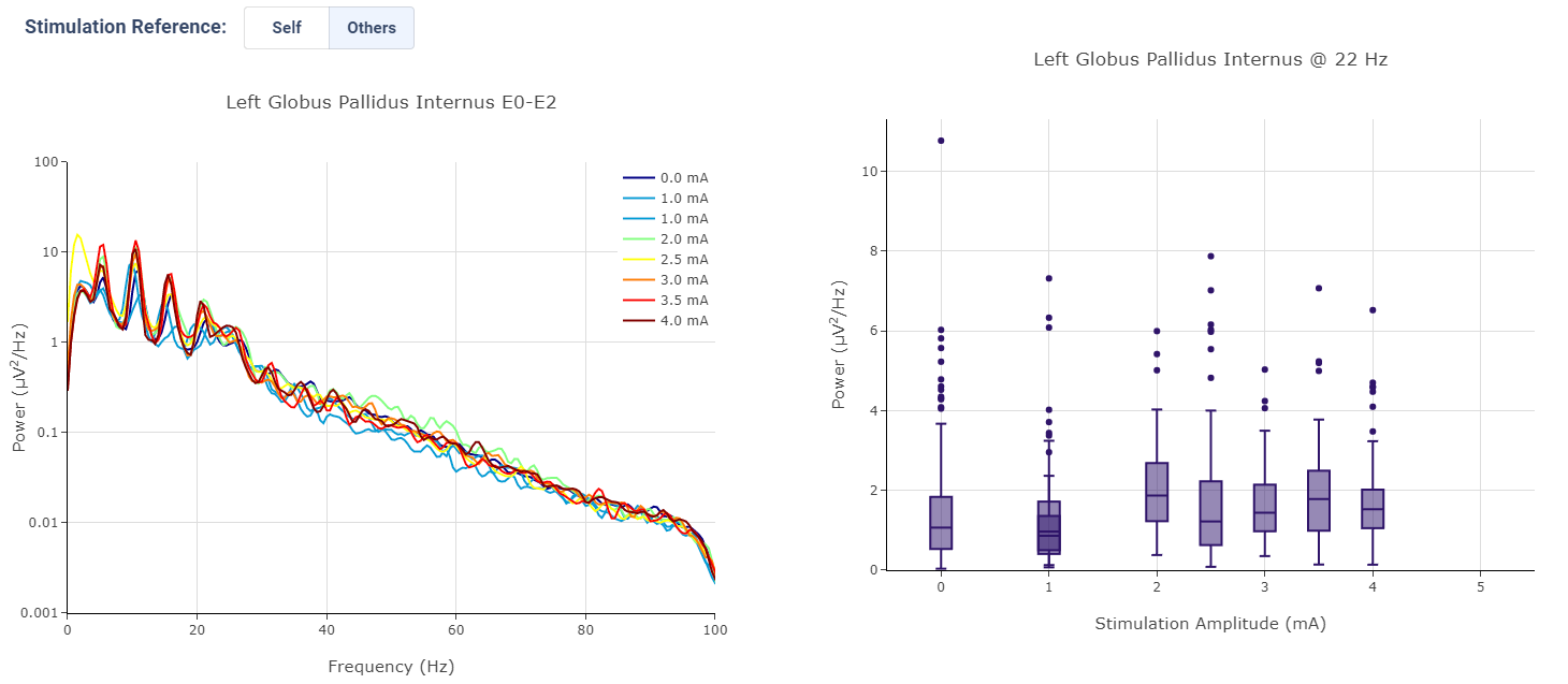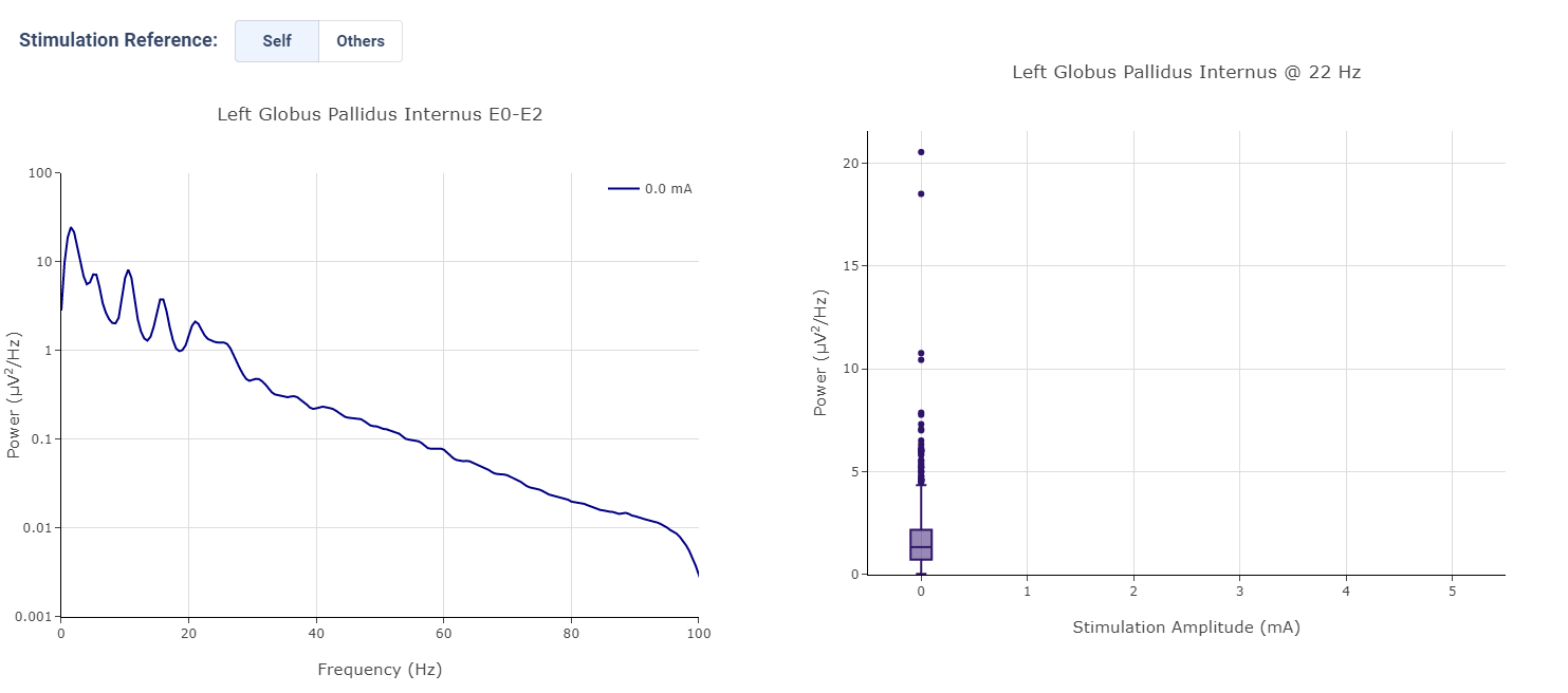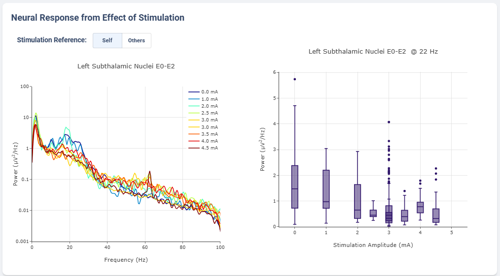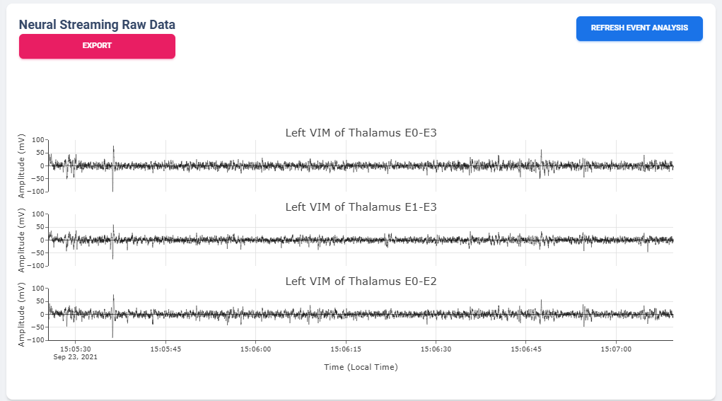 Neural Activity Streaming is one of the most detailed analysis provided by the platform. Neural Activity Streaming describe the neural recording collected during the real-time streaming of neural signal during therapy setup. Neural Activity Streaming allow simultaneous bilateral recording if both hemisphere are configured, but only one channel at a time. In addition, only Sensing-friendly configuration (E00-E02, E01-E03, E00-E03) are allowed to minimize effect of stimulation artifacts. Often time, users may start Neural Activity Streaming and adjust stimulation parameters to see effect of stimulation on the brain signal.