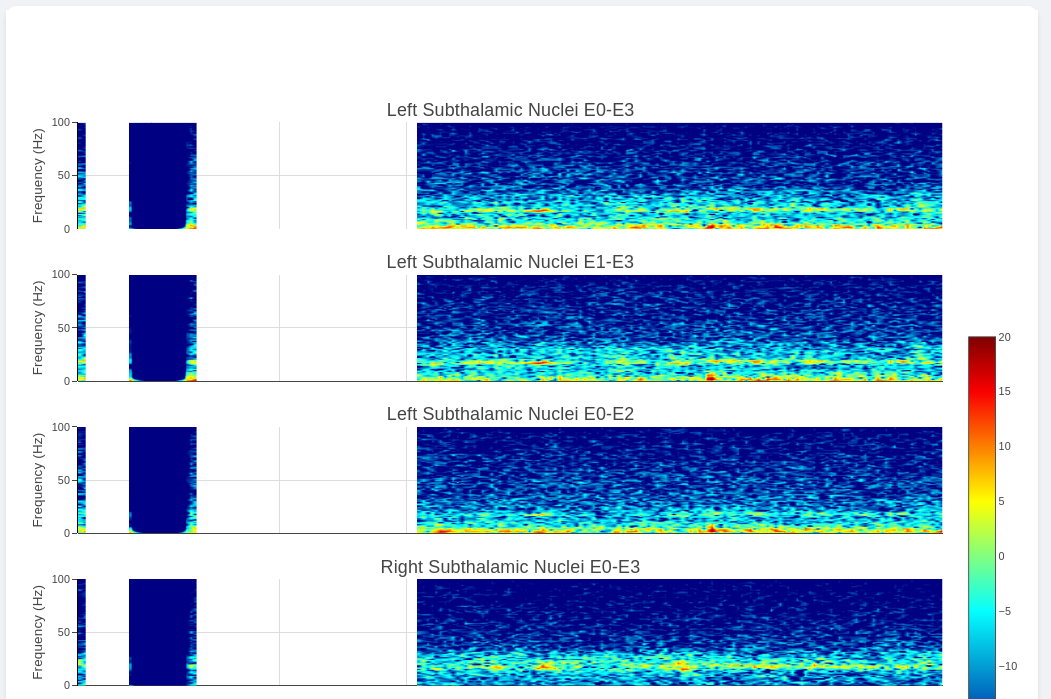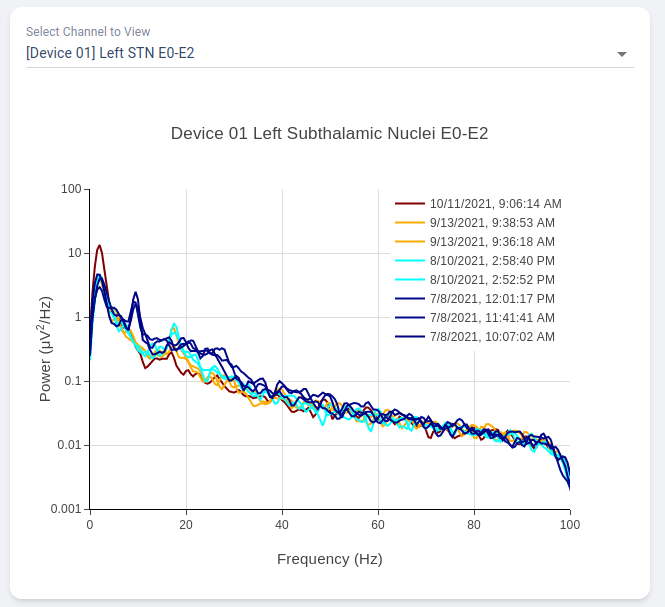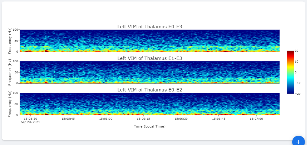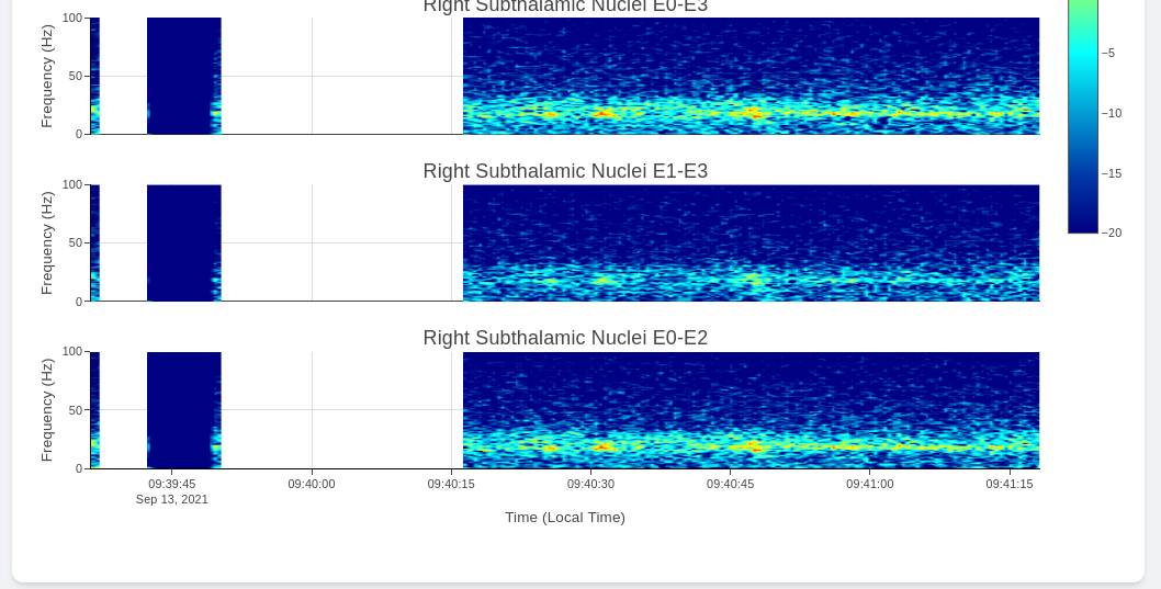 Multi-Channel Activity is similar to Neural Activity Streaming, but it doesn’t come with stimulation parameters nor other labels. In exchange for that, the device allows simultaneous recording up to 6 channels at the same time (Bilateral E00-E02, E01-E03, and E00-E03). We align all recordings collected at the same time and perform quick time-frequency analysis display to the user.