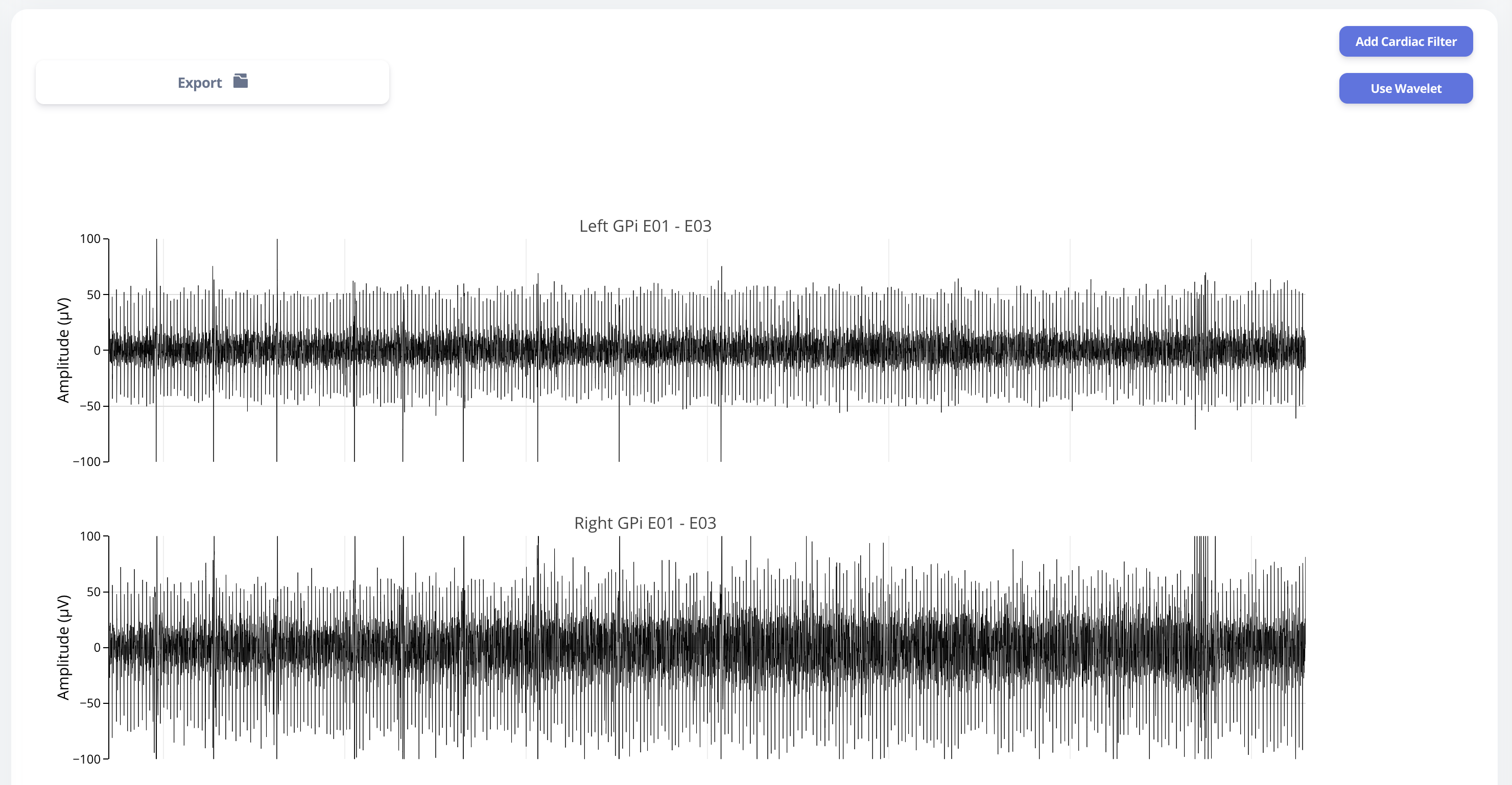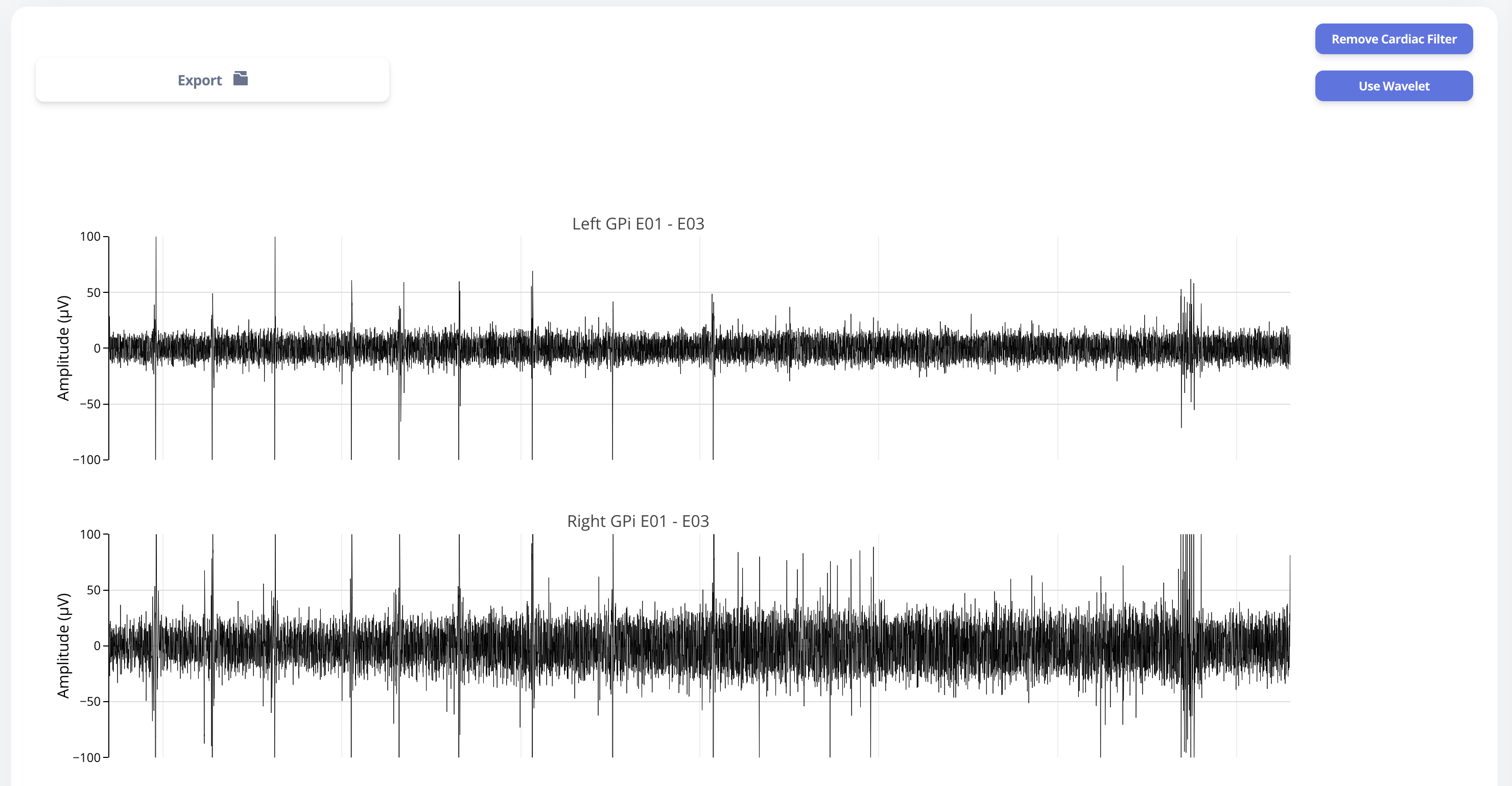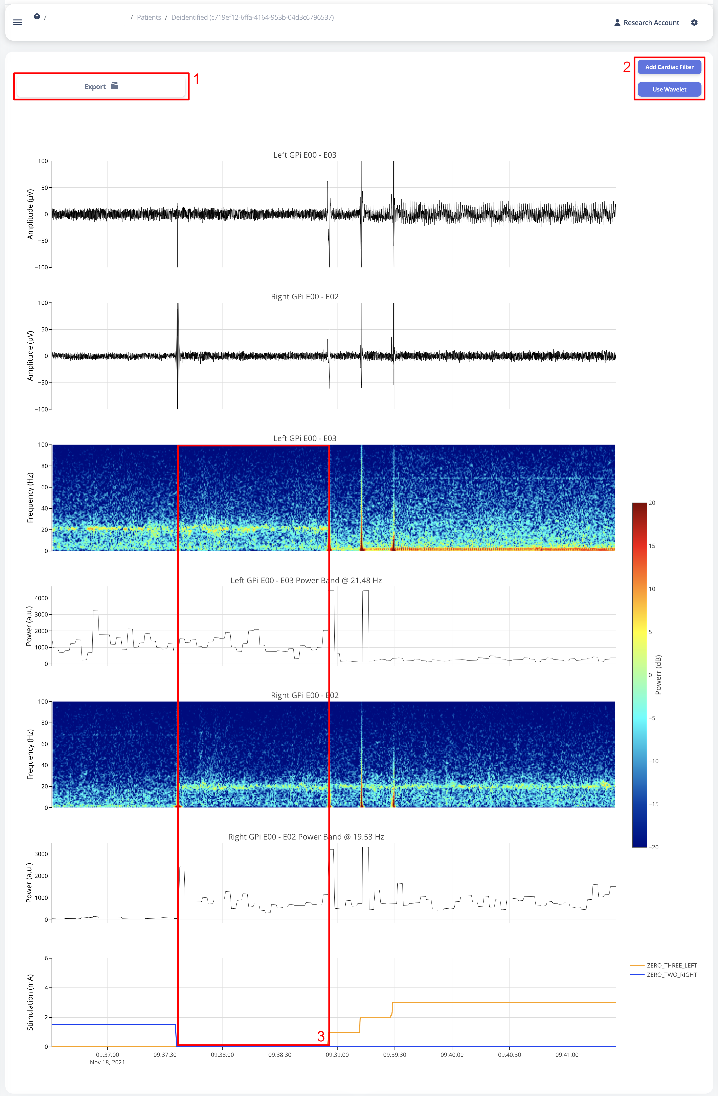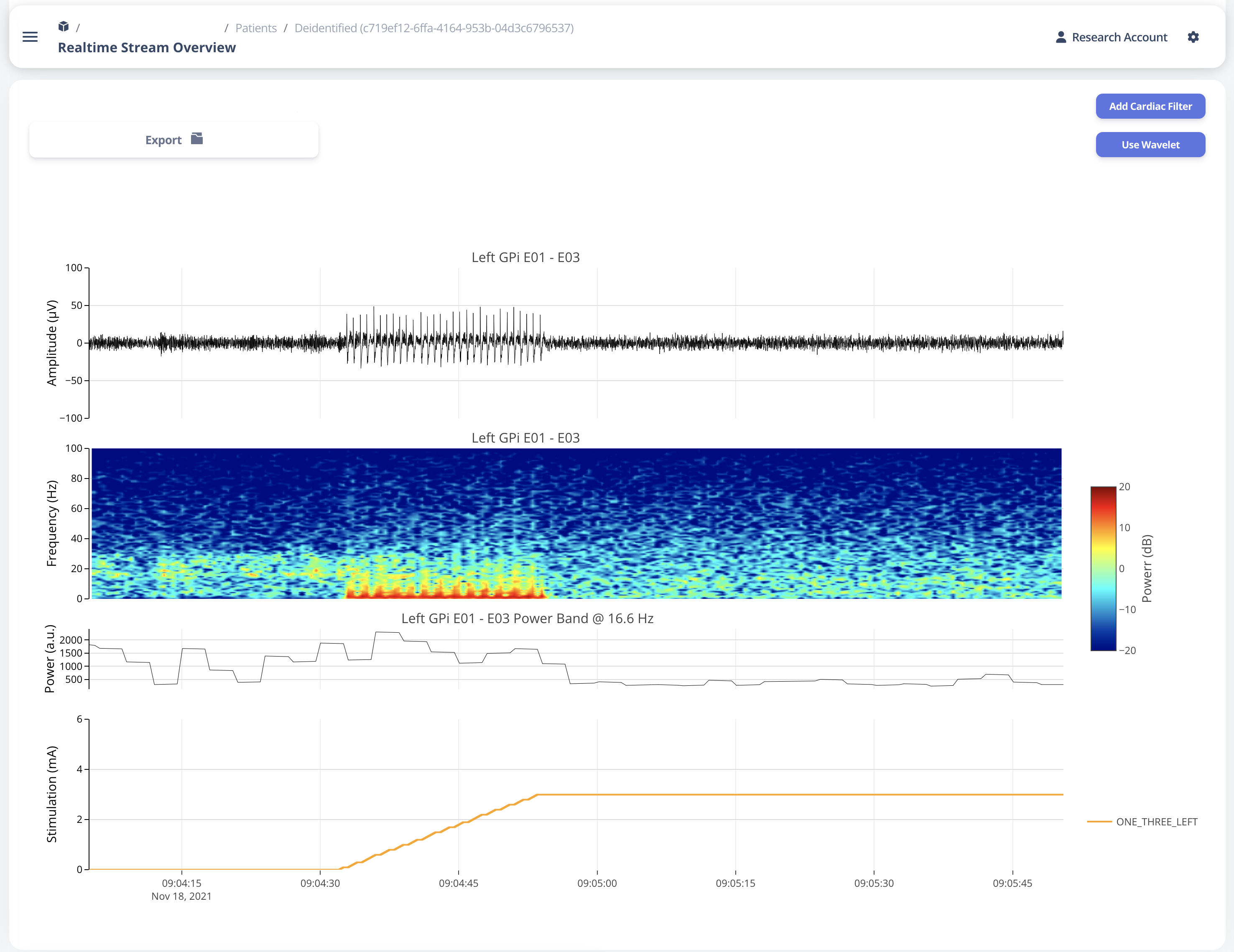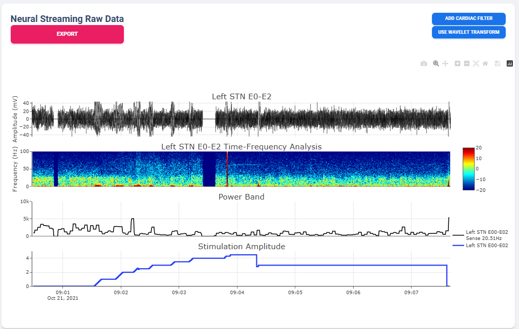 User may choose to export the raw data. The export will generate a CSV file easily loaded in any scientific programming languages. The data are aligned if left and right hemisphere both present in the recording. Timestamp are provided as UTC timestamp in seconds. Aligned stimulation values are provided for identification of stimulation period.