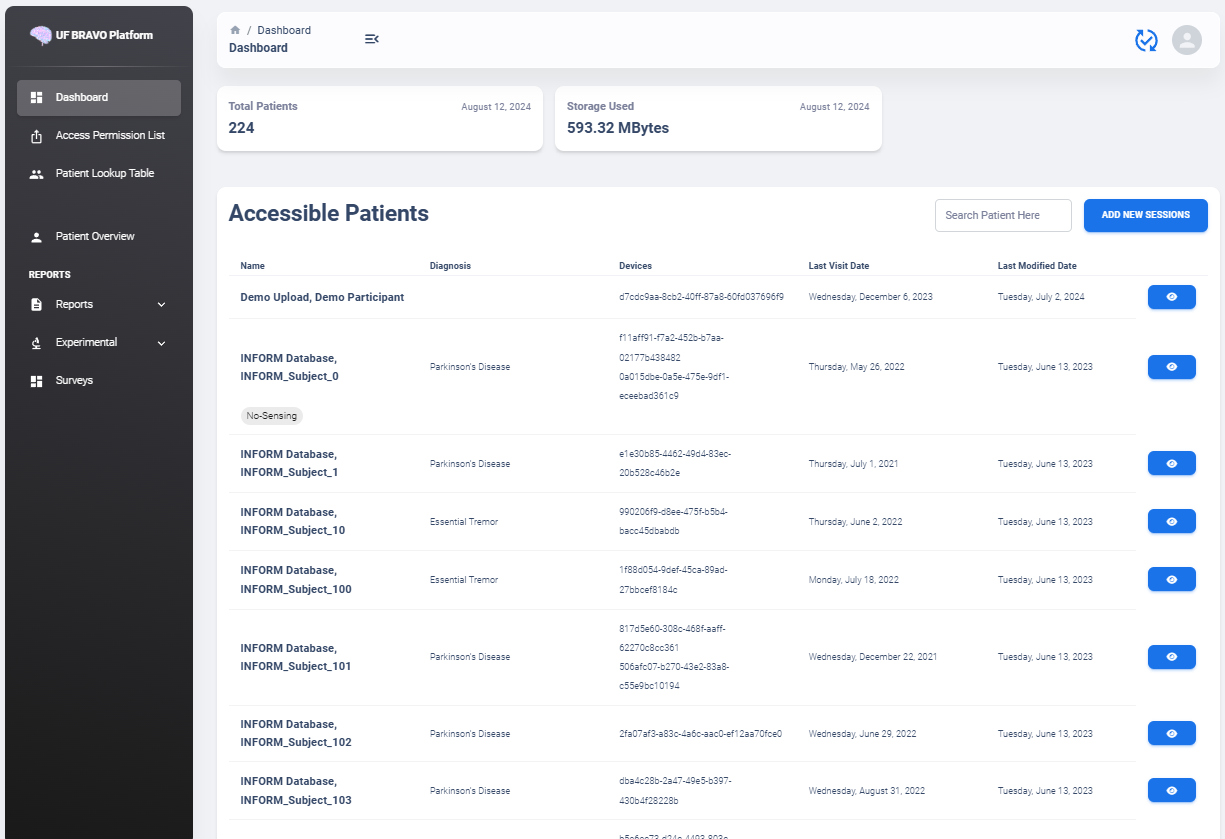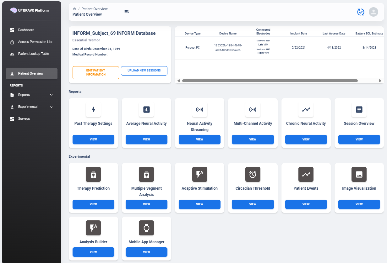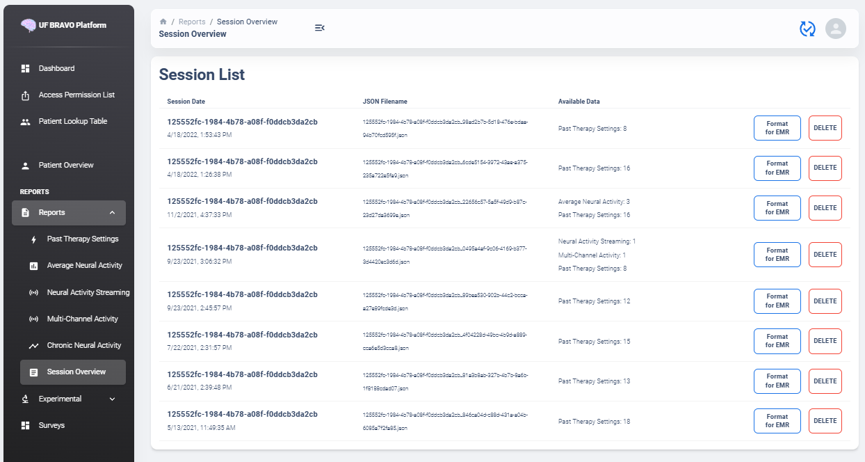 The Usage Documentation will provide basic overview on functionality supported by UF BRAVO Platform frontend. UF BRAVO Platform is a Python-based Web Application designed to process and analyze third party medical device data. This documentation is intended to provide detail explainations on all functions currently available to the users.