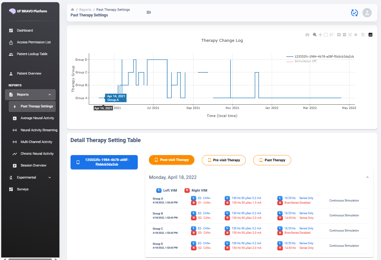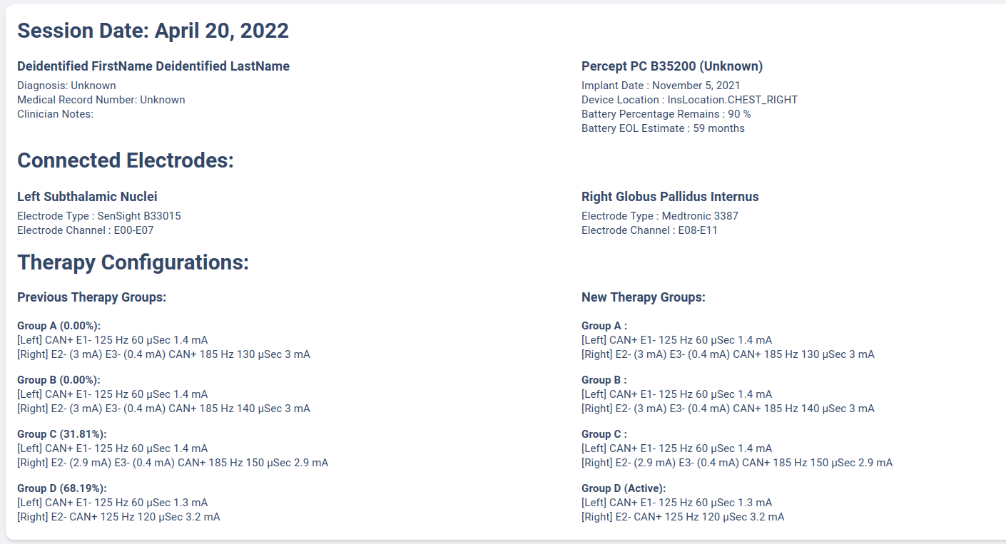 The therapy configuration extracted from GroupHistory typically contains all information about the stimulation. For example, in above figure we present a typical therapy configurations for a patient before their session on December 6th, 2021. If you want to view post-session settings, you can toggle the selection to Post-visit Therapy to enable display.